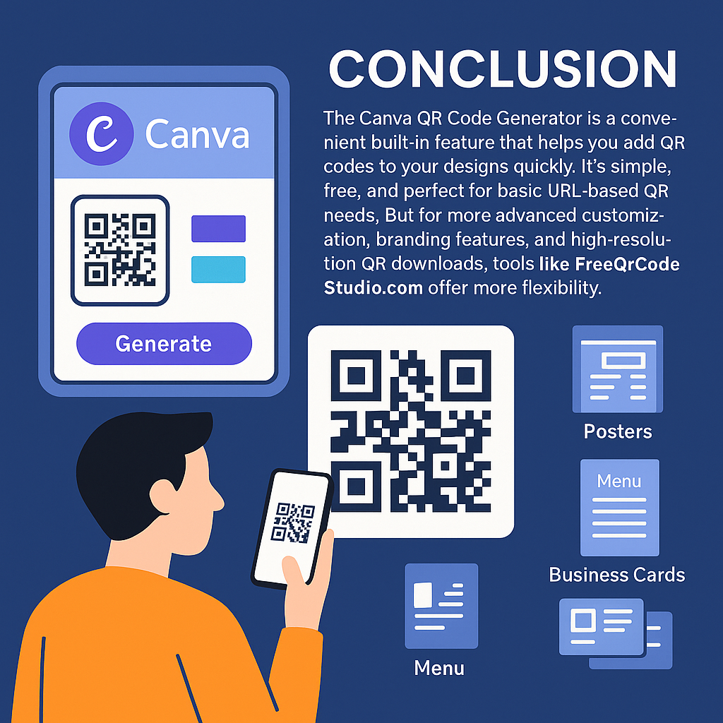 The Canva QR Code Generator is a convenient built-in feature that helps you add QR codes to your designs quickly. It’s simple, free, and perfect for basic URL-based QR needs. But for more advanced customization, branding features, and high-resolution QR downloads, tools like FreeQrCodeStudio.com offer far more flexibility.